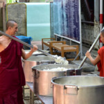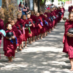 Around Mandalay there are some nice spots like the U Bein Bridge in Amarapura, a 1.2 km teak bridge, the Sagaing hilltop, with its golden pagodas or Innwa, a small village where we made a horse cart tour. In addition, we assisted to a unique ceremony where thousands of monks get their lunch from one family each day at the same hour in the… monastery.